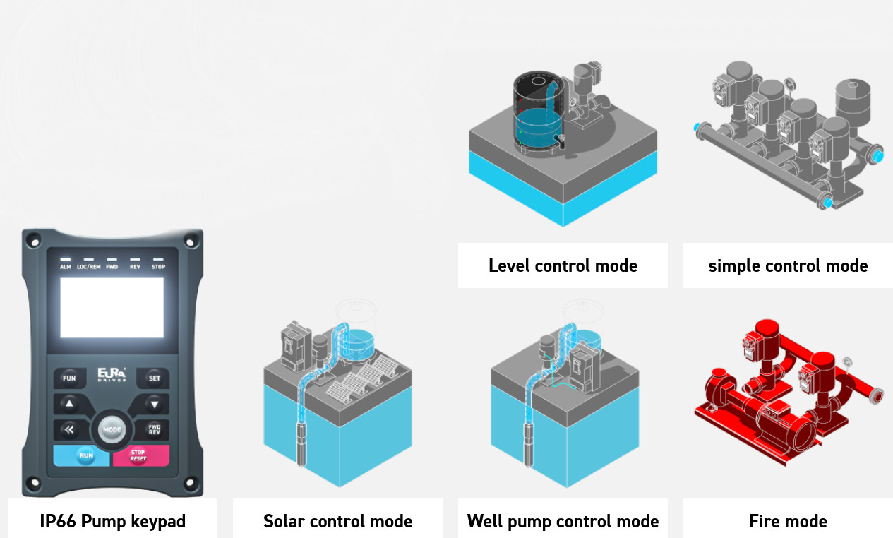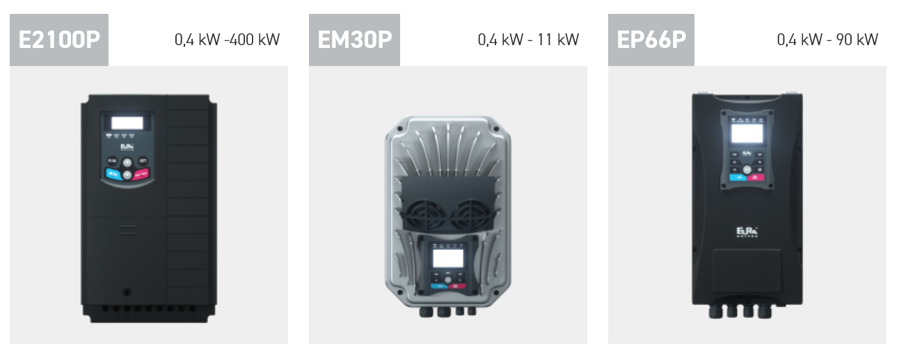 Pre aplikáciu vodného čerpadla EURA Drives vyvinul komplexný špeciálny softvér pre meniče E2100, EP66 a EM30, ktoré pokrývajú stupeň ochrany od IP20 do IP67.